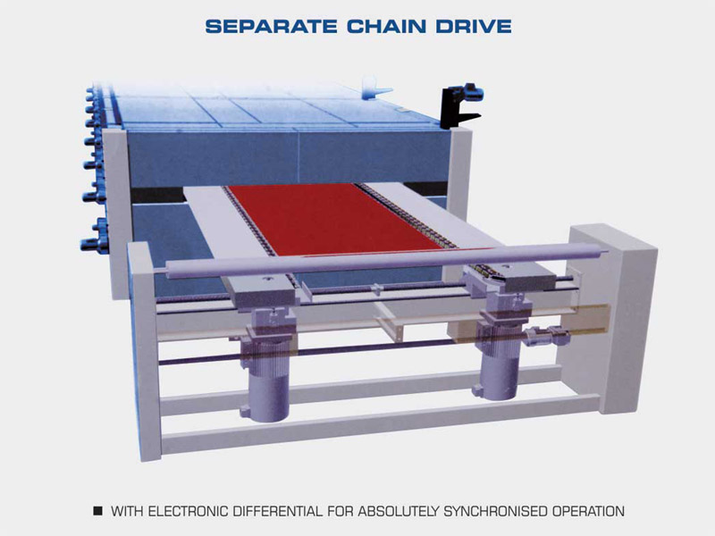 PINNING DEVICE WITH DRIVEN AFTER-PINNING BELT SYNCHRONISED DRIVE SYSTEMS FOR EFFICIENT PINNING AND RELIABLE AFTER-PINNING EVEN WITH LARGE OVERFEEDS AND HIGHLY ELASTIC FABRICS. PNEUMATIC OPERATION FOR LIFTING AND LOWERING IN PROCESS-OPTIMISED SEQUENCE. THE DRIVE IS SYNCHRONISED WITH THE DRIVE OF THE STENTER CHAIN, THUS PREVENTING ANY SHIFTING OF THE MESH STRUCTURE. LONG SERVICE LIFE OF THE BRUSH BELT AS IT IS NOT SUBJECTED TO FRICTION. SUITABLE FOR KNITTED FABRIC RANGES.